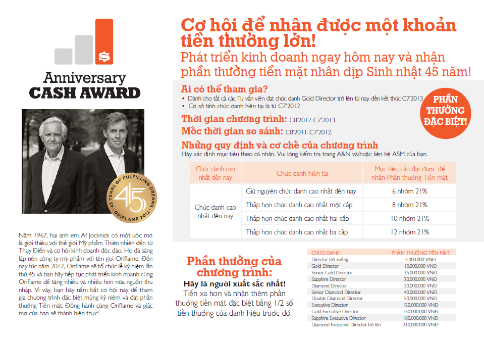 www.NgocThuyGroup.com – Năm 1967, hai anh em Af Jocknick có một ước mơ là giới thiệu với thế giới Mỹ phẩm Thiên nhiên đến từ Thụy Điển và cơ hội kinh doanh độc đáo. Họ đã sáng lập nên công ty mỹ phẩm với tên gọi Oriflame. Đến nay tức năm 2012, Oriflame sẽ tổ chức lễ kỷ niệm lần thứ 45 và bạn hãy tiếp tục phát triển kinh doanh cùng Oriflame để tăng nhiều và nhiều hơn nữa nguồn thu nhập. Vì vậy, bạn hãy nắm bắt cơ hội này để tham gia chương trình đặc biệt mừng kỷ niệm và đạt phần thưởng Tiền mặt. Đồng hành cùng Oriflame và giấc mơ của bạn sẽ thành hiện thực!